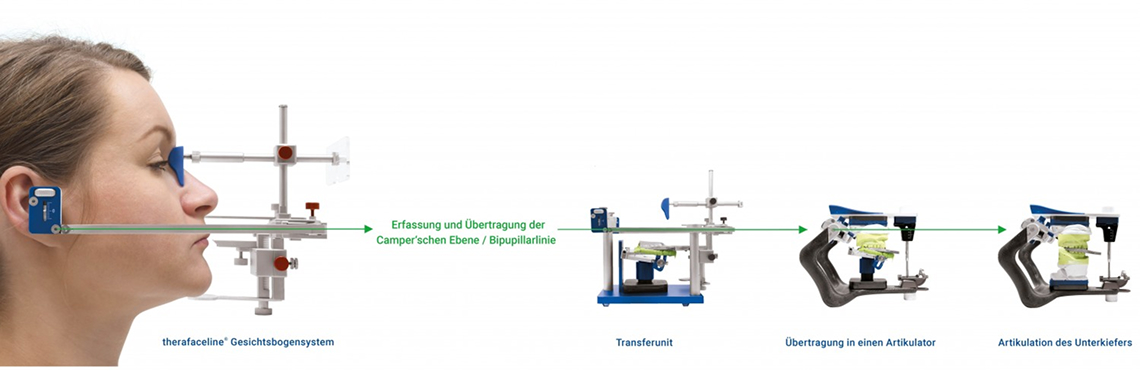 therafaceline® ist der erste Gesichtsbogen, mit dem die schädelbezügliche Lage des Oberkiefers und die Bisshöhe des Unterkiefers in einem Schritt erfasst werden kann. Als Referenzebene dient die Camper'sche Ebene.